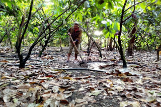 Một người dân trong vườn ca cao được trồng sau khi có hợp đồng thu mua với doanh nghiệp, một hình thức liên kết theo chuỗi khá phổ biến đối với cây cao ca. Ảnh: NH